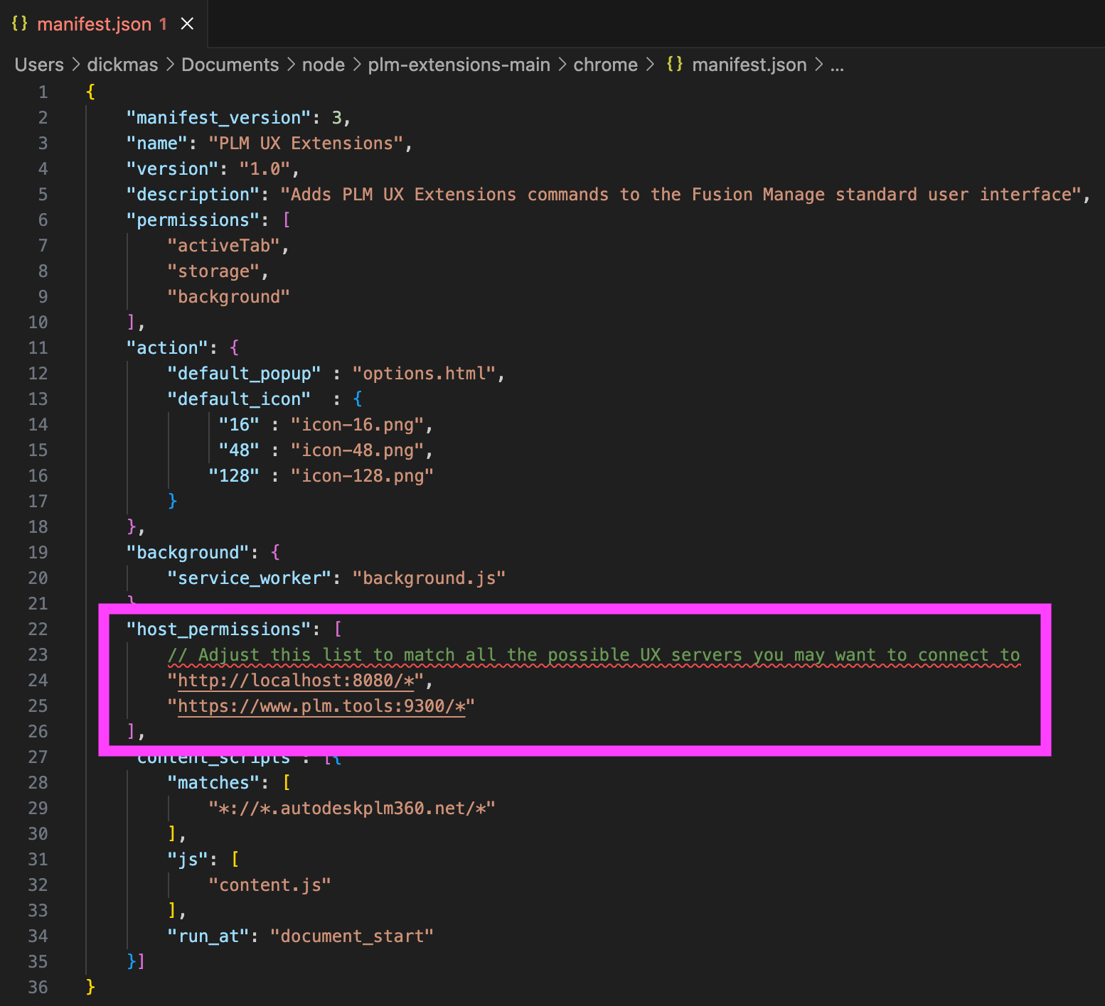 The installation files of this Chrome Extension extension can be found in folder chrome contained in the PLM UX Extensions server folder. However, it is not recommended to install the extension using this folder. Instead, you should download the installer files using the given button on the server landing page first. This is because the installation files must be kept on the client after the installation to make the extension work. Also, this download wil update the installer files to ensure that the extension has the required permissions to work: Before downloading the files, the server will update the installation files (i.e. manifest.json) granting access permssion for this Chrome Extension. As the additional commands and buttons are dynamically driven by the PLM UX Extensions server, your PLM UX Extensions server must be listed as permitted host as shown below. This given change will be performed automatically when downloading the installation files from this server's landing page.