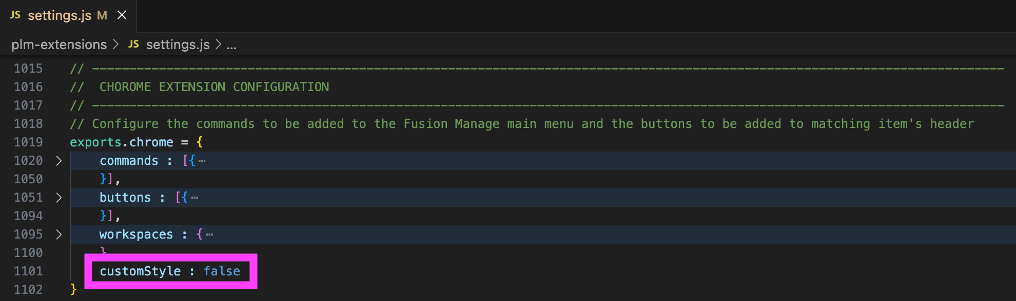 The commands property defines the list of commamds being added to the main menu of Fusion Manage. These commands will only be shown if the user has admin permission in the tenant as this list contains the Administration Utilities of the PLM UX Extensions only. Each command is defined by the following settings: